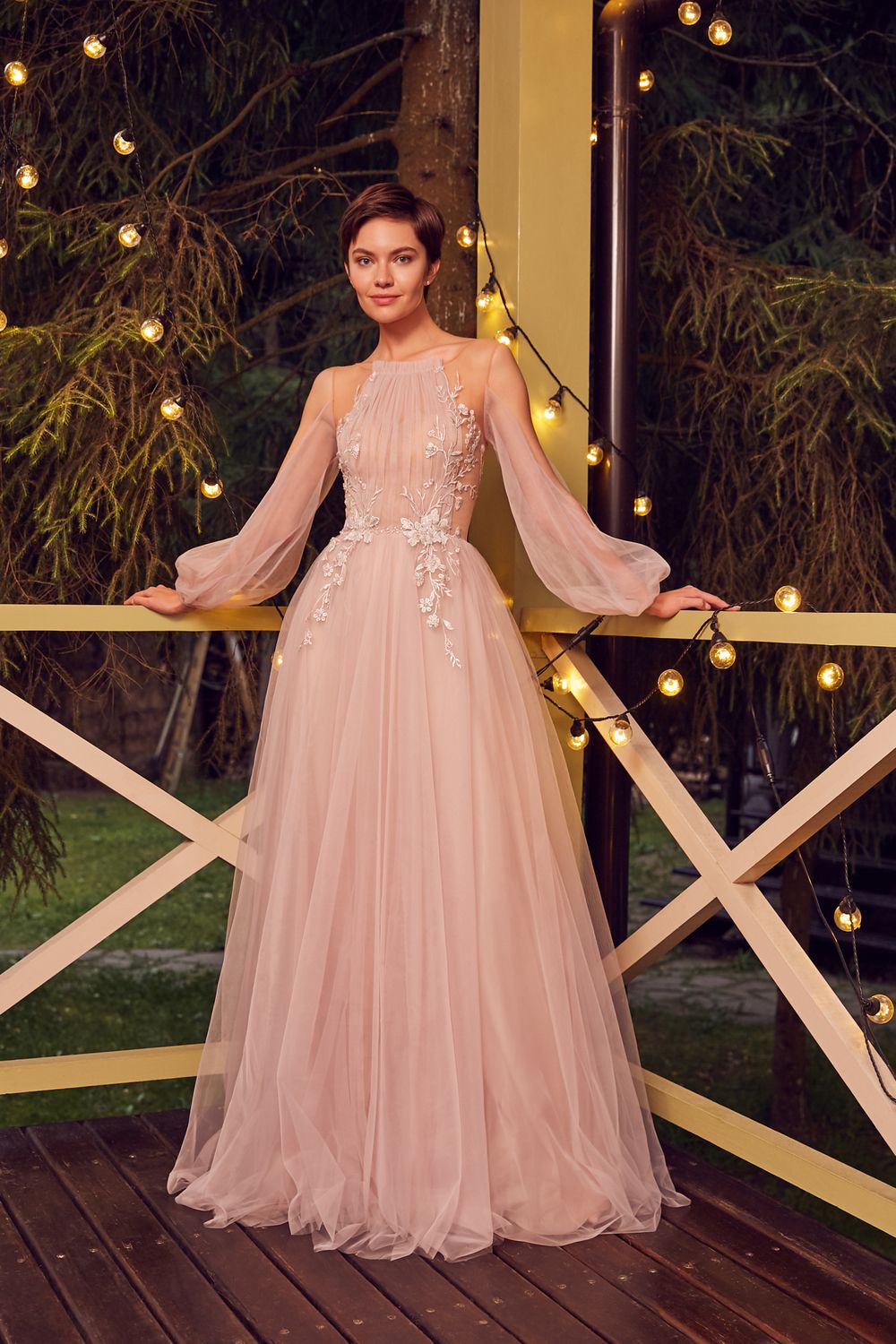 Длинное платье А-силуэта Ивисона украшено ажурной вышивкой, выполненной в цветочном мотиве. Закрытый верх с полуобнаженной спинкой дополняет фатиновая юбка большого размера. В платье с корсетом и длинными рукавами предусмотрены прозрачные вставки, позволяющие оставаться с открытыми плечами. Верх с объёмными рукавами выполнен из густо драпированного фатина.