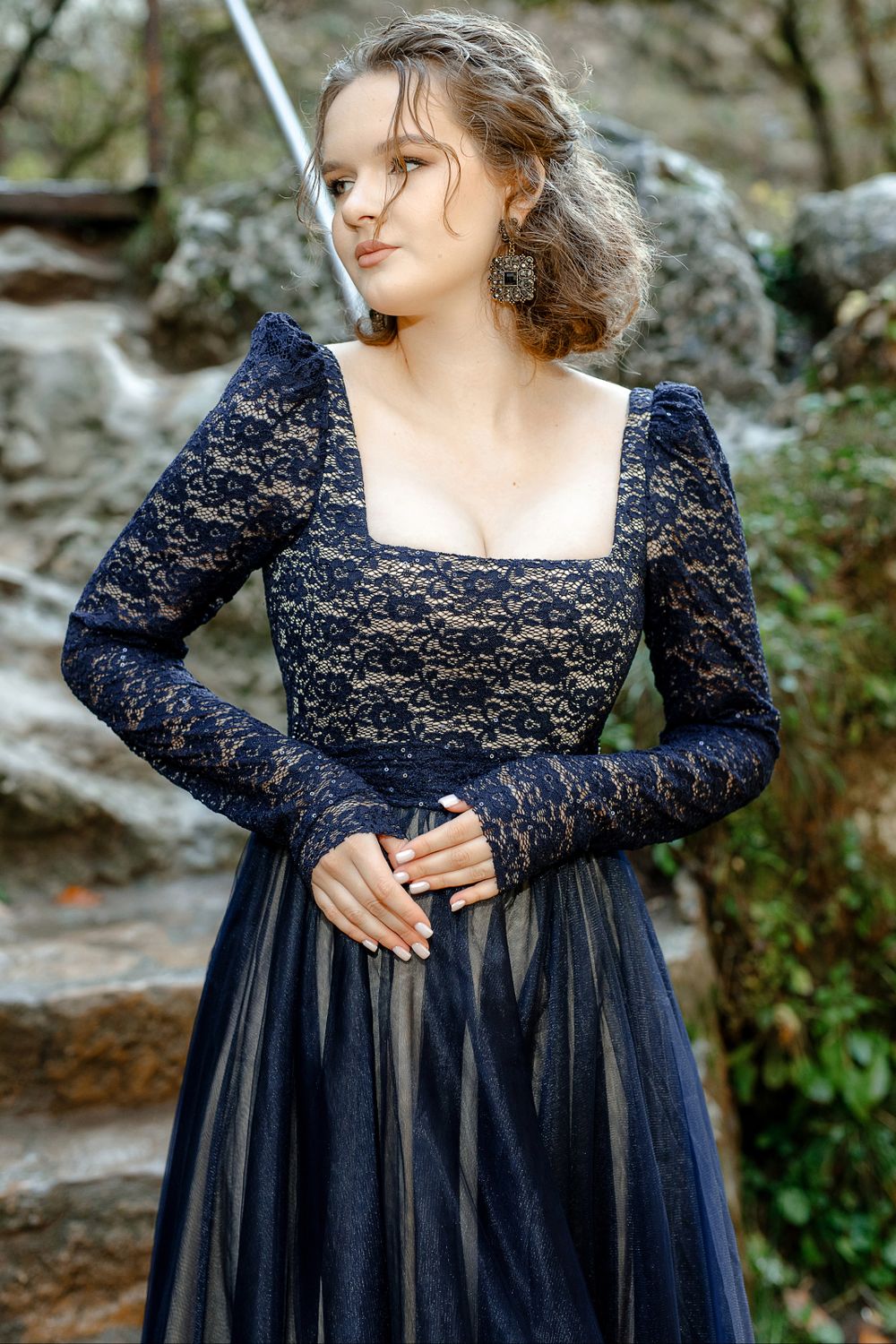 А-силуэт, Длинные, Фатиновые, Кружевной верх, С вырезом на спинке, С длинным рукавом, С рукавами, Декольте, С корсетом, С разрезом на ноге, Коллекция 2025