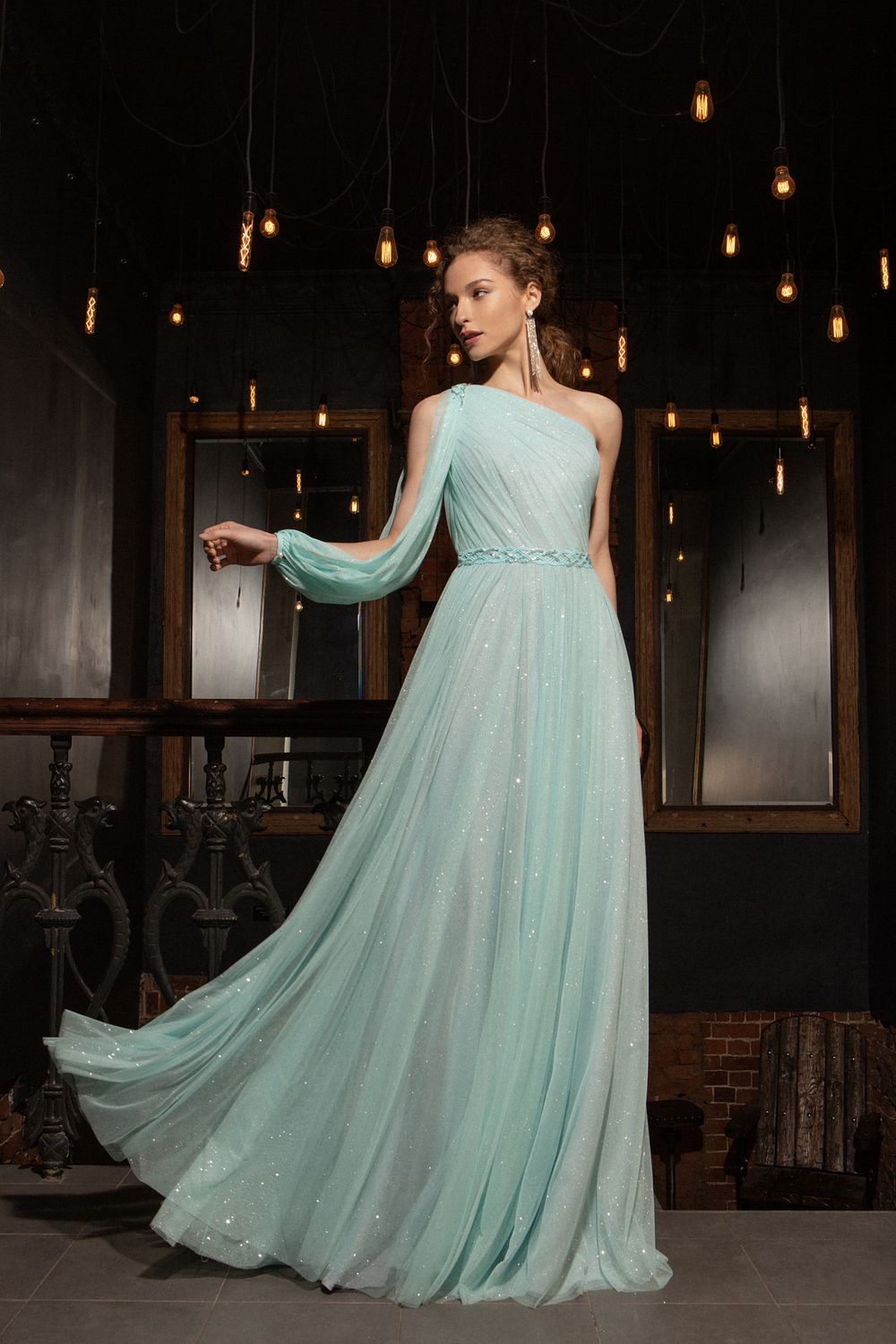 Фатиновое платье А-силуэта Милада – лучший наряд для особого, торжественного случая. Оригинальный крой модели без корсета гармонично сочетает рукав и открытые плечи. Блестящая ткань собрана небольшими складками, придающими женскому образу воздушность. Прямая длинная юбка образует невесомое лёгкое облако, отчего фигура становится летящей.