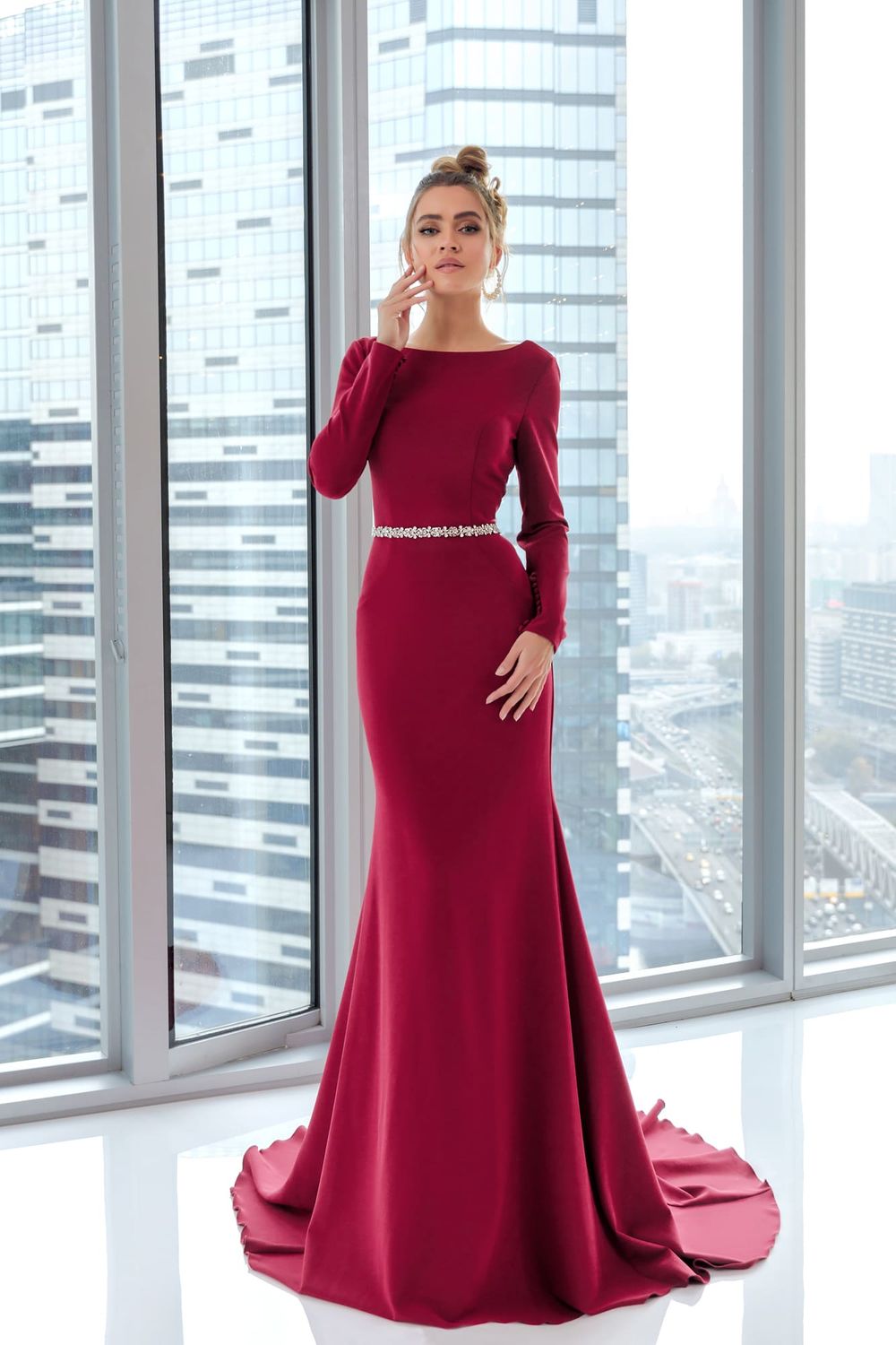 Платье с лаконичным дизайном 19003 олицетворяет элегантность и чувственность, которая к лицу девушкам любого возраста. Ткань со стрейчем хорошо тянется и создаёт приталенный силуэт. Закрытый верх без корсета с открытой спинкой и длинным рукавом украшен декоративным поясом из блестящих страз. Юбка со шлейфом облегает бёдра и расширяется к низу.
