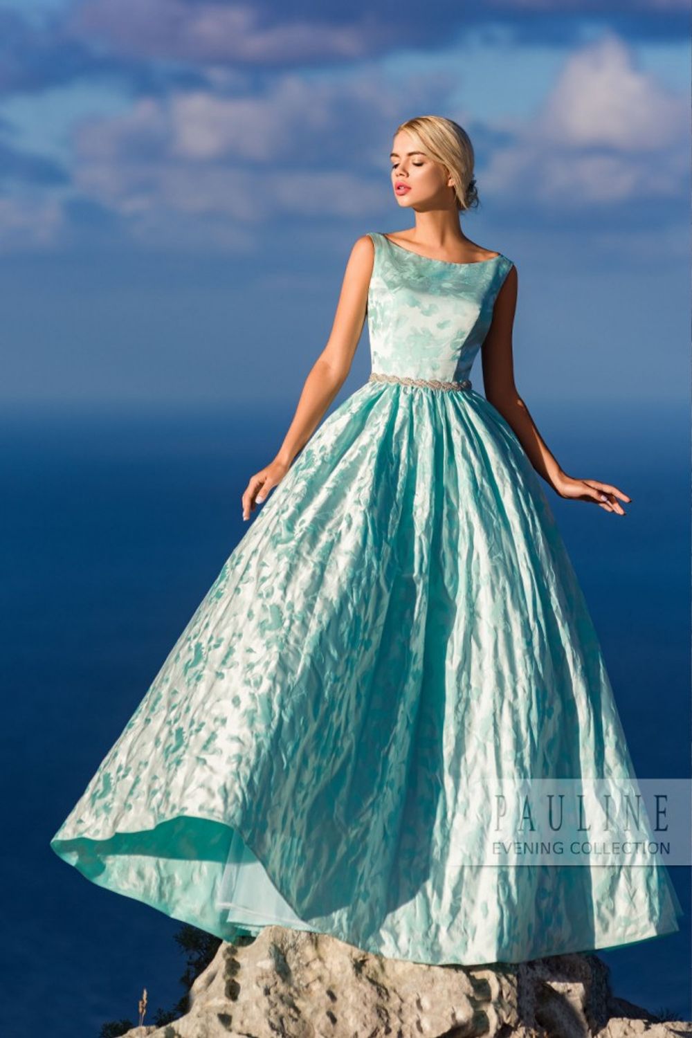 Как греческая Афродита явилась миру в жемчужной раковине средь пены морской - пред вашим взором Ниагара: отражение чистого лазурного неба в стремительных потоках каскадных водопадов объединились в сочетании этого платья. Классически строгий верх платья маечкой с вырезом лодочкой и необузданно широкая юбка, как будто сплетены оригинальным серебряным плетеным пояском.