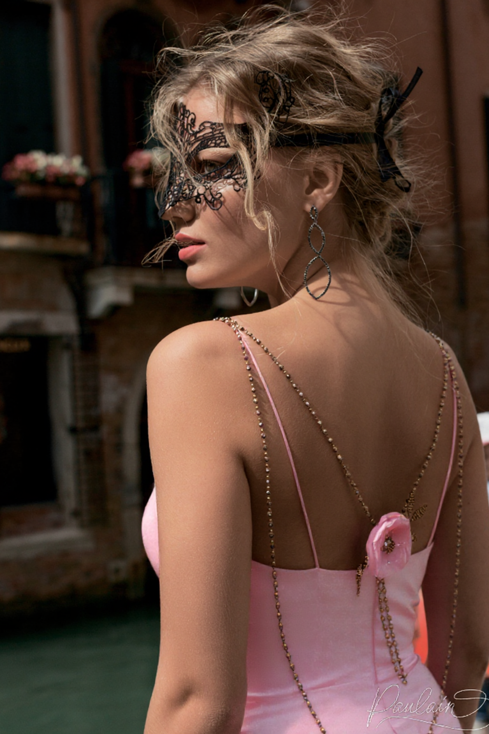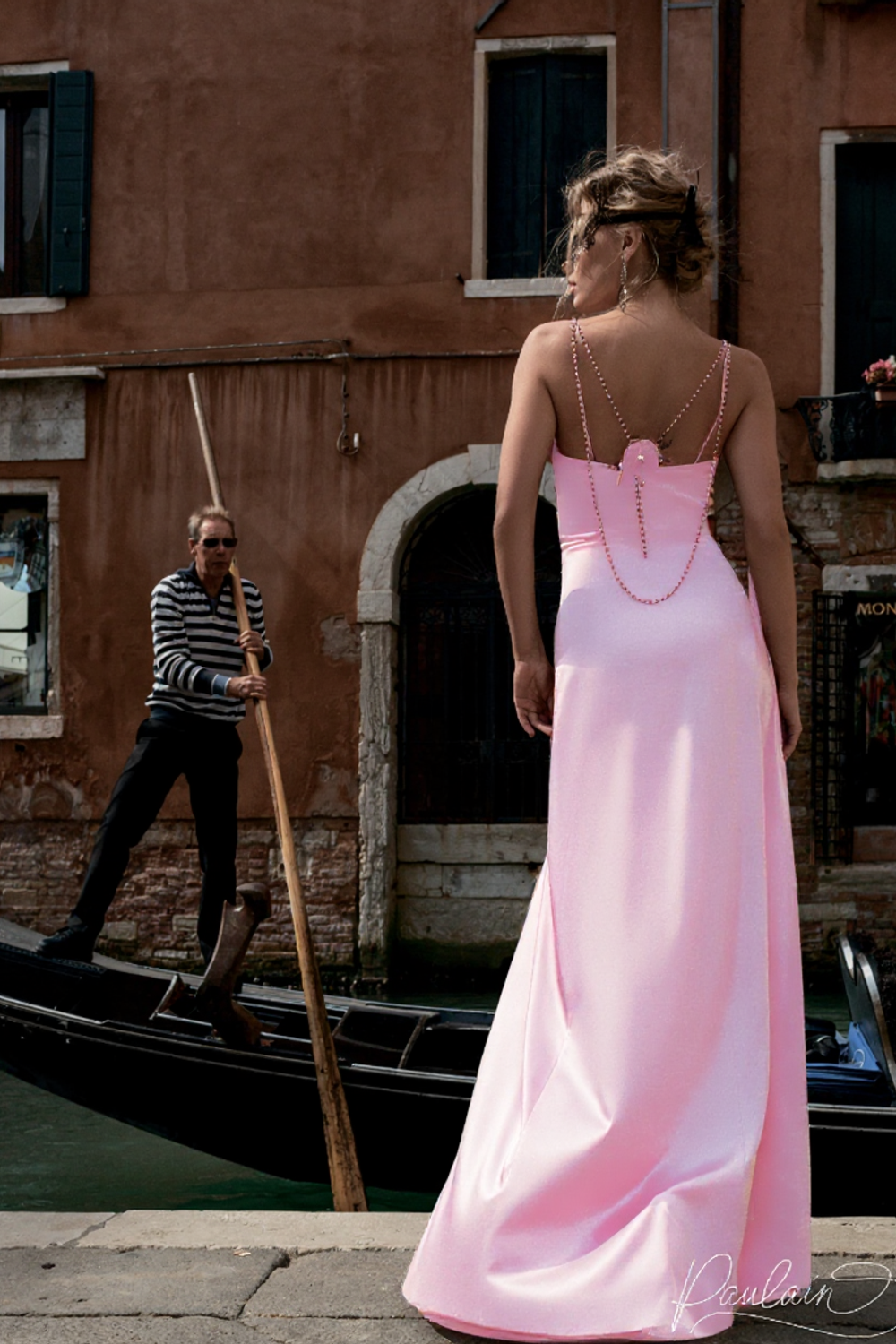 Прямое платье Роуз изготовлено из шёлка и выполнено в бельевом стиле, которому характерен минимализм. Открытое декольте без корсета на бретельках дополняет длинную юбку с разрезом на ноге. Сзади лаконичное платье украшено декоративным цветком. Атласное платье с открытыми плечами и бусами на спине можно надеть на пляжную и коктейльную вечеринку.