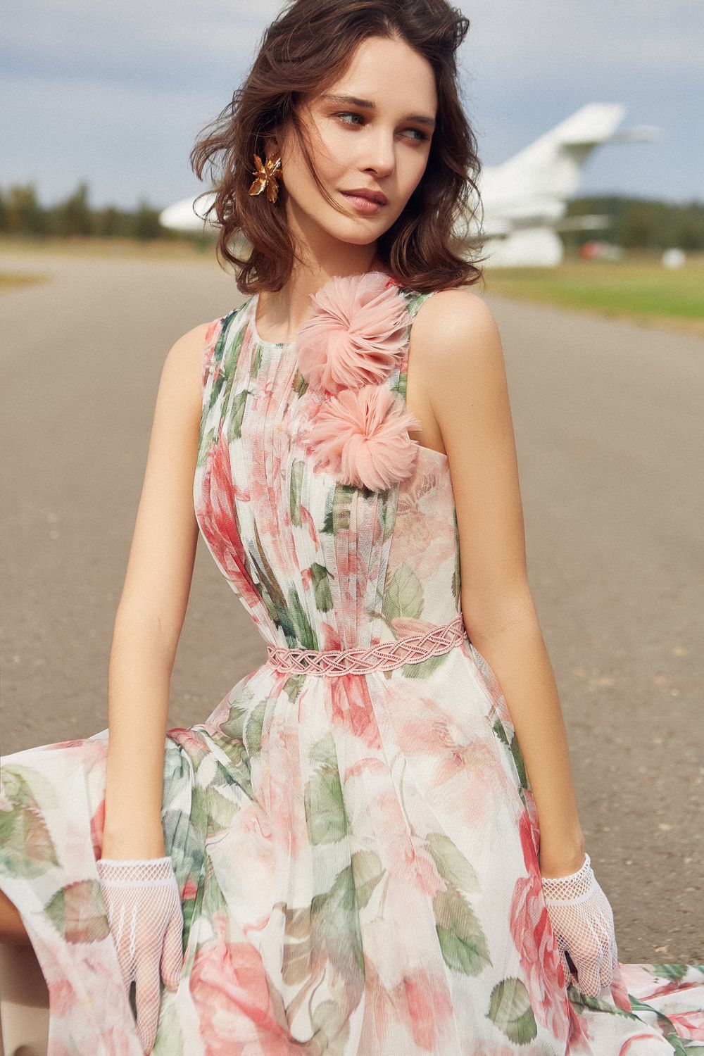 Коктейльное платье Каррер — наряд с классической длиной миди, который можно носить много раз и по любому поводу, а не только на выпускной. Фатиновое платье с закрытым верхом без корсета украшено драпировкой с тонкими складками, объёмными цветами и фигурным поясом. Свежесть наряду в А-силуэте придаёт крупный цветочный принт, расположенный от горловины до подола.