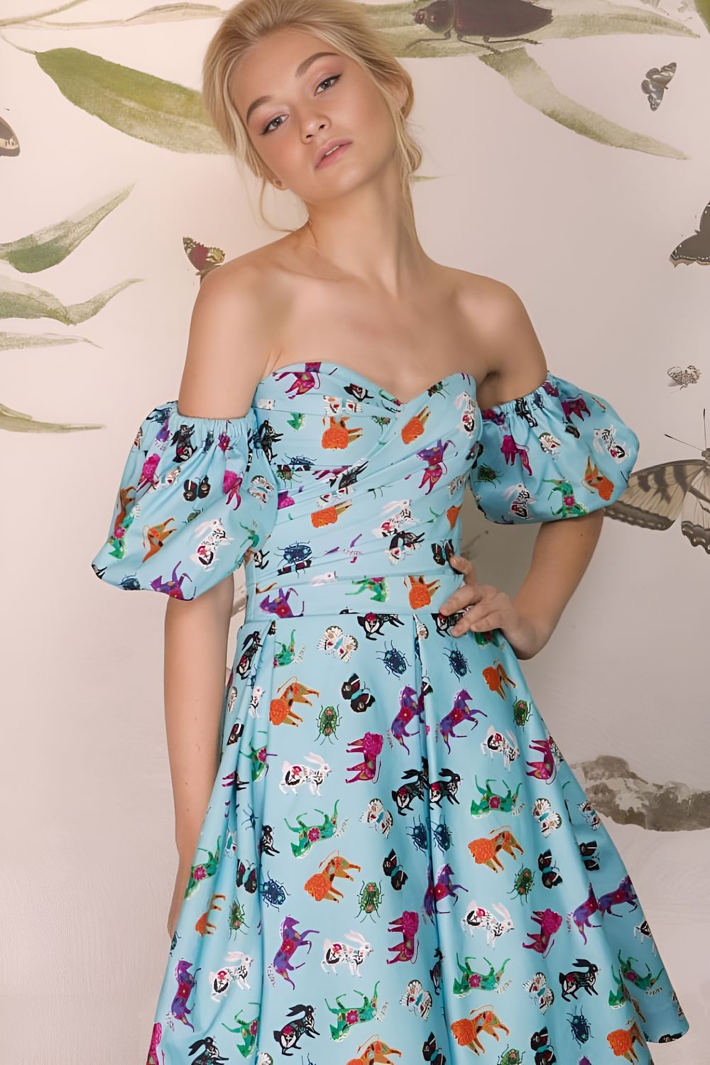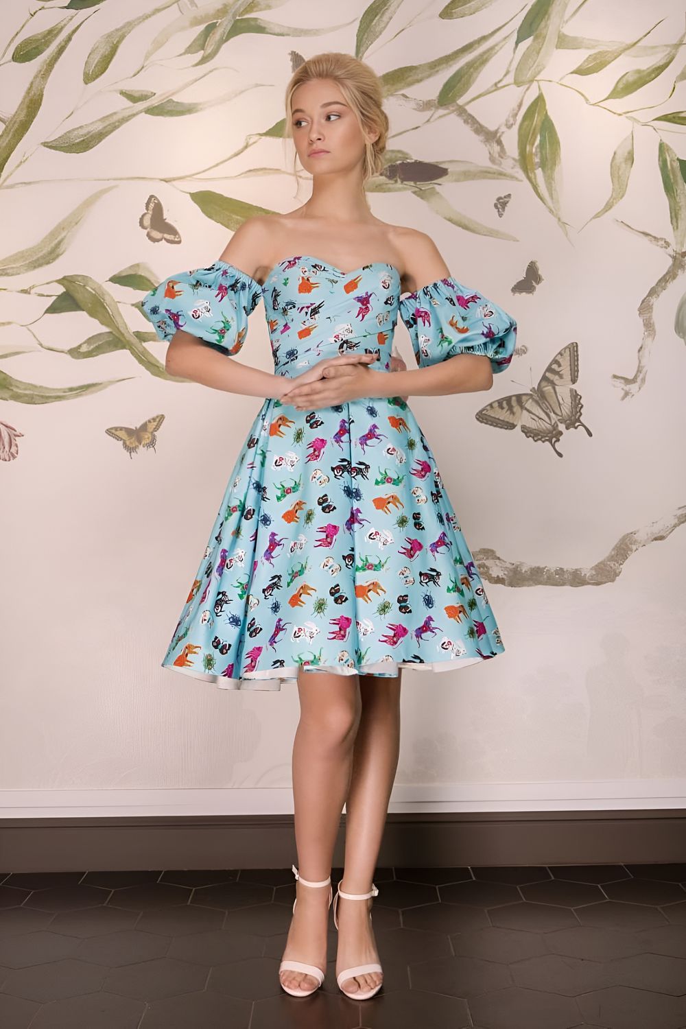 Принт, украшающий атласное платье Кони, придаёт модели оригинальный вид. Роскошный наряд с корсетом, декольте-сердечком и открытыми плечами выглядит изящно. Внимание привлекают спущенные рукава уникального кроя и пышная короткая юбка, собранная красивыми крупными складками.