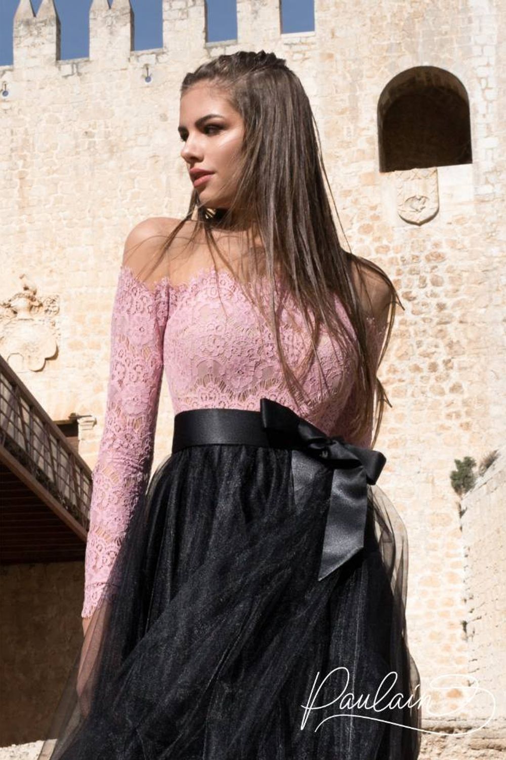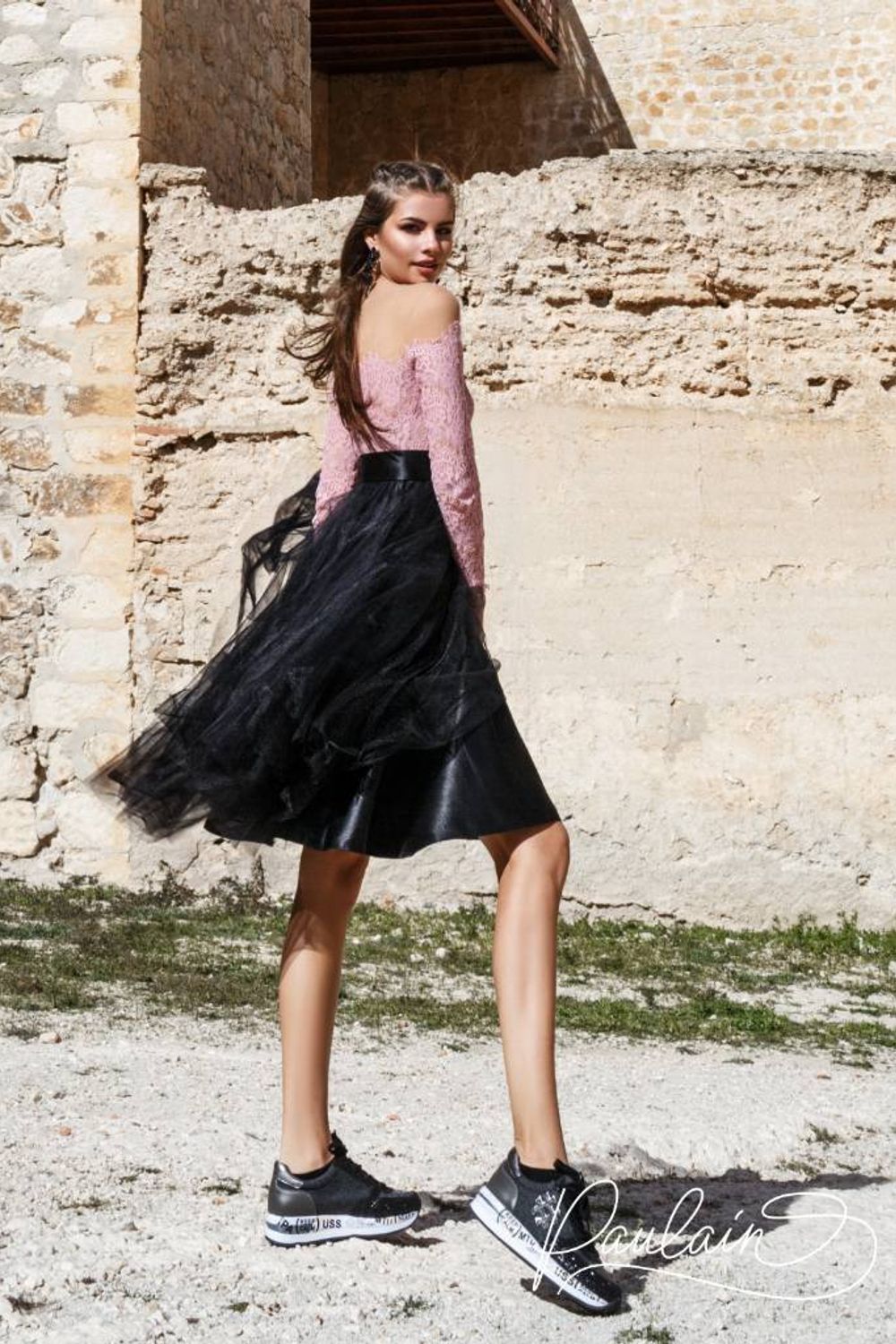 Платье-миди с кружевной спинкой и рукавами Дворцовый переворот изменит мнение о заурядном дизайне. В нём собраны различные фактурные ткани. Атласная юбка — единственная гладкая деталь, скрытая под фатиновым слоем. Её текстуру выдает пышный бант на талии. Короткий кружевной верх без корсета с длинным рукавом.