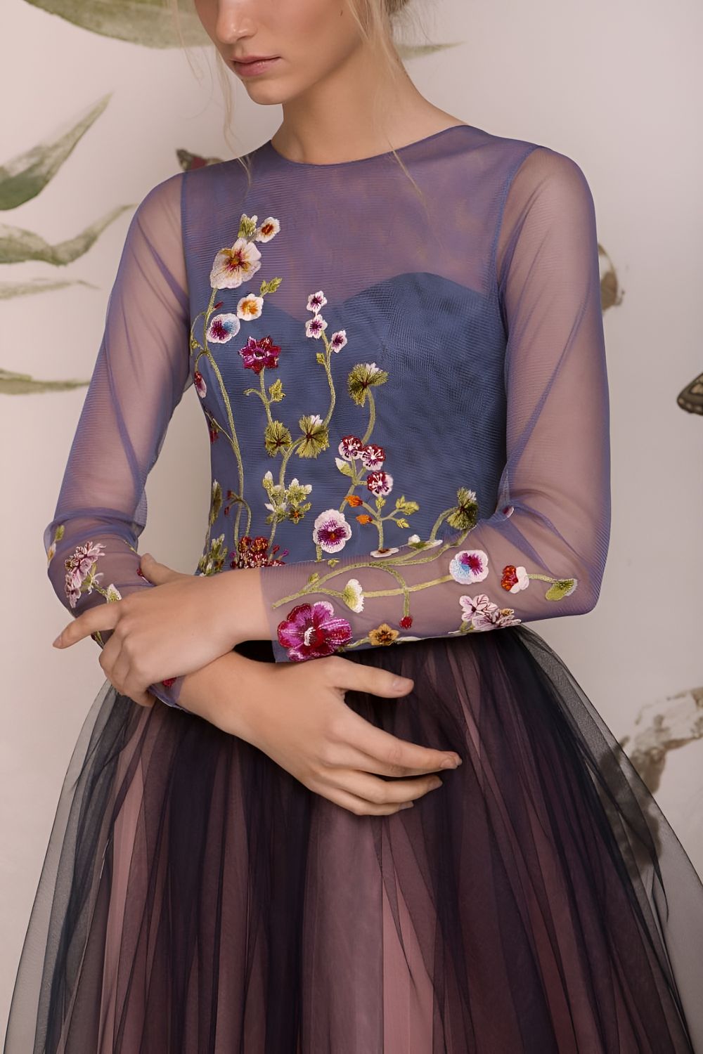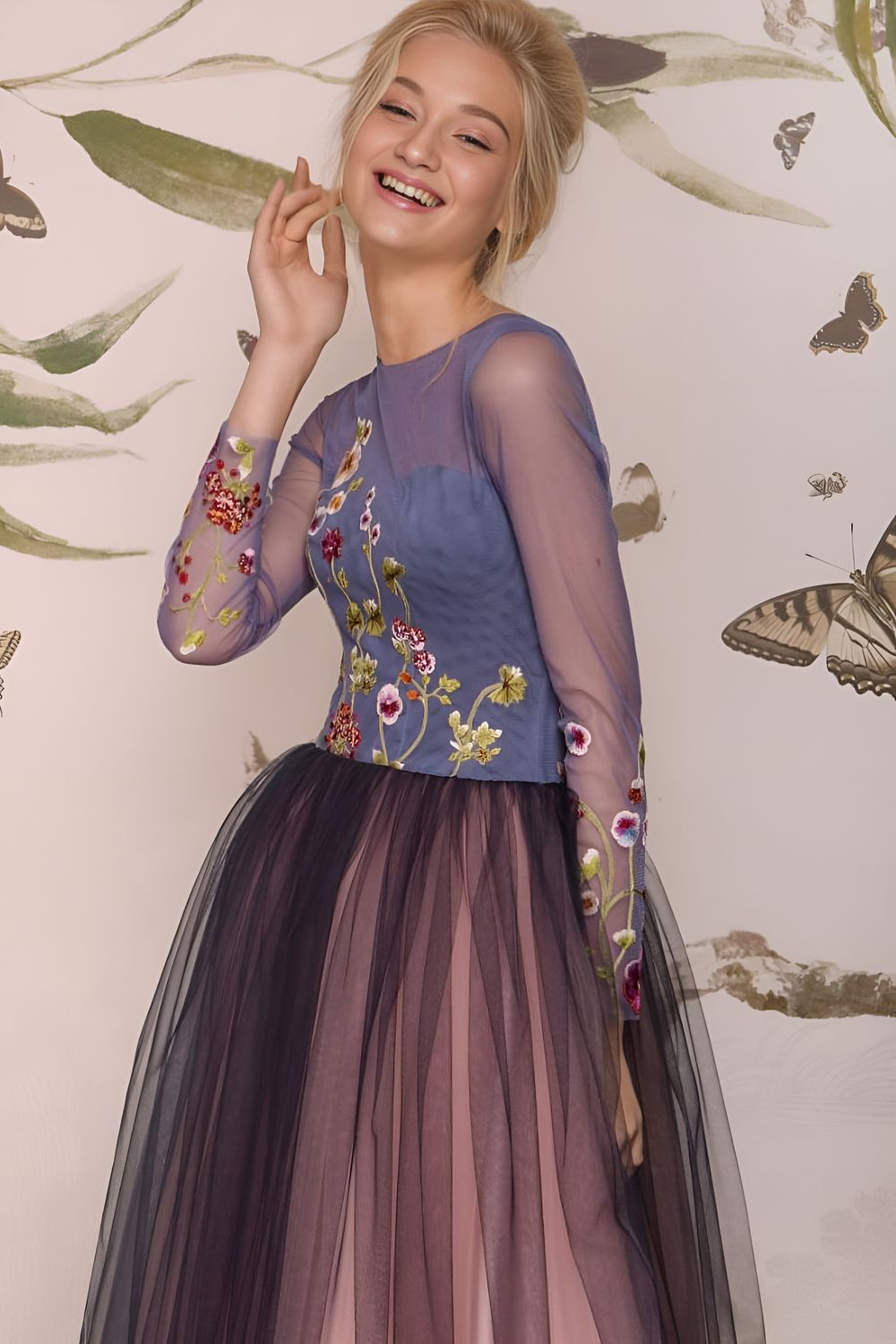 Платье с длинными рукавами и кружевным верхом Фиона для выпускного, вечеринок, торжественных мероприятий. Короткий лиф с декольте в форме сердца закрыт сетчатой тканью, расшитой цветочной вышивкой. Закрытый верх с корсетом и длинными рукавами облегает грудь и талию. Пышная юбка-миди покрыта фатиновым слоем. В ассортименте большие размеры.