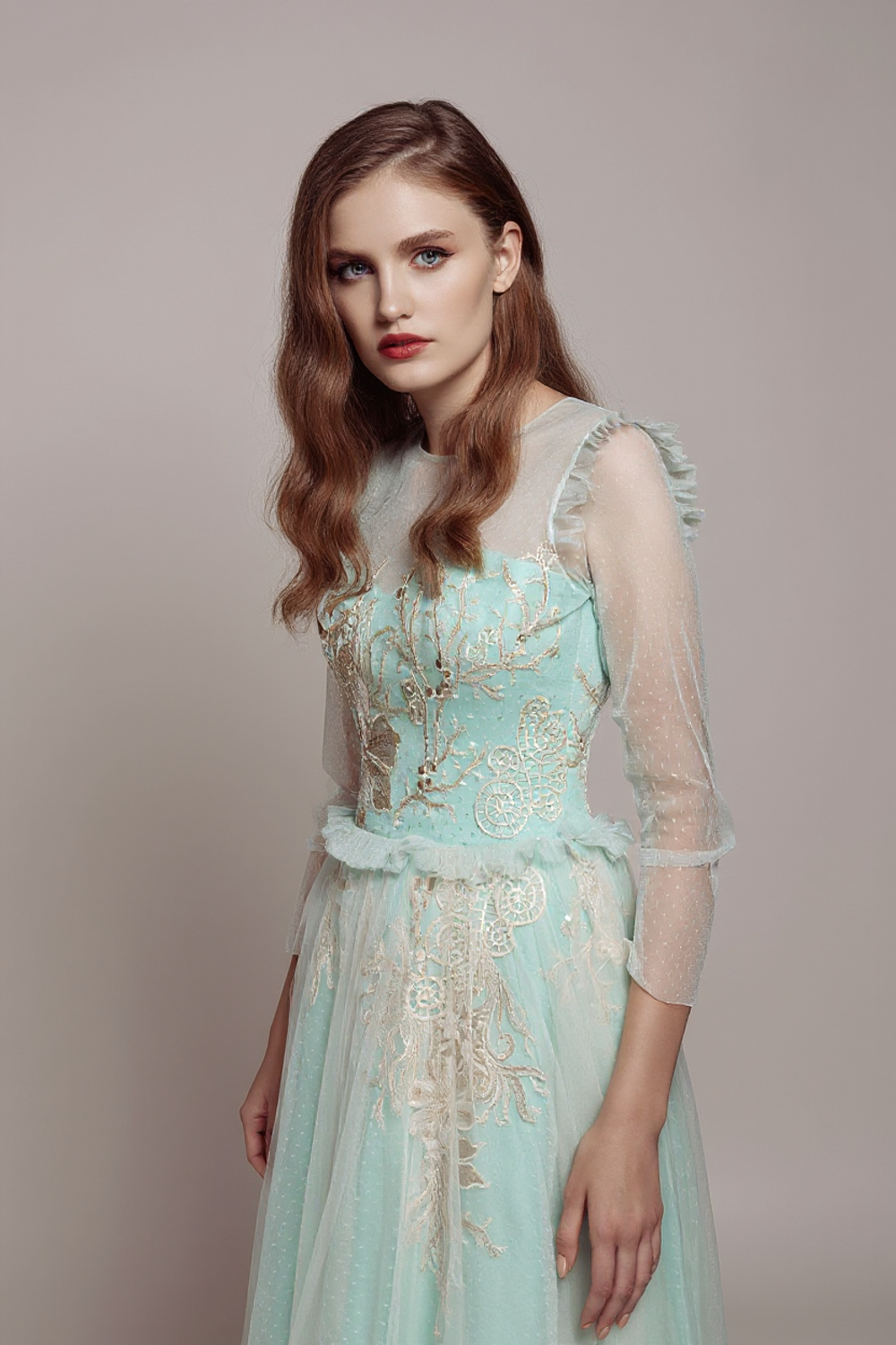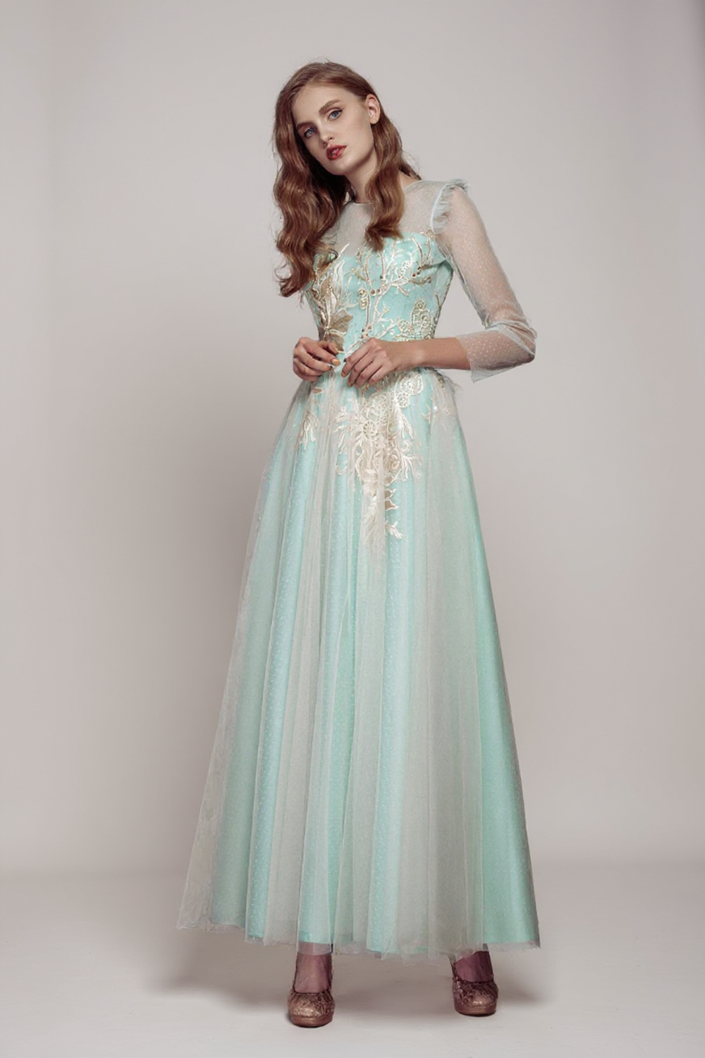 Платье А-силуэта Никта с длинным рукавом создаст загадочный образ для юных модниц. Его можно надеть на выпускной и торжественные мероприятия по другим случаям. Кружевной верх с длинной юбкой украшен цветочной вышивкой, которую скрывает верхний полупрозрачный слой. Фатиновый закрытый верх с корсетом и с рукавами украшают оборки на поясе и плечах.