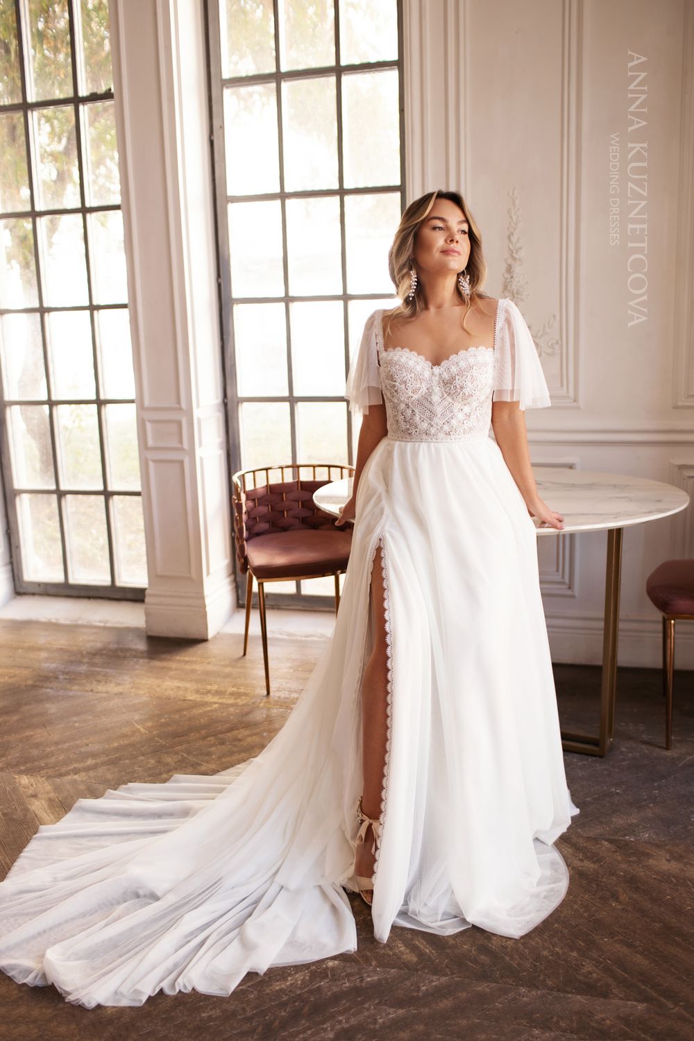 Пышное платье-трансформер Сейн-Л в греческом стиле выполнено в А-силуэте и дополнено кружевным верхом с открытой спинкой и линией декольте в виде сердечка. Модель большого размера украшают съёмные рукава из лёгкой фатиновой материи. Сняв их, можно получить лиф с корсетом на бретельках с открытыми плечами и кружевной спинкой. Длинная юбка украшена высоким разрезом на ноге.