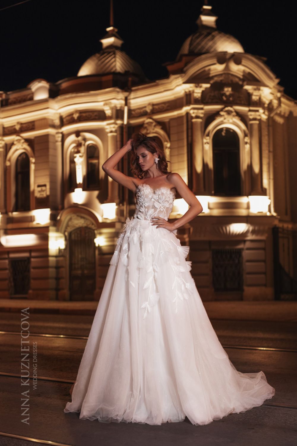 Пышное платье А-силуэта с корсетом и с открытой спинкой производит впечатление с первого взгляда. В модели Виен зона декольте украшена блестящей кружевной аппликацией, которая постепенно переходит на длинную фатиновую юбку. Оригинальный декор платья с открытыми плечами создаёт незабываемый образ.