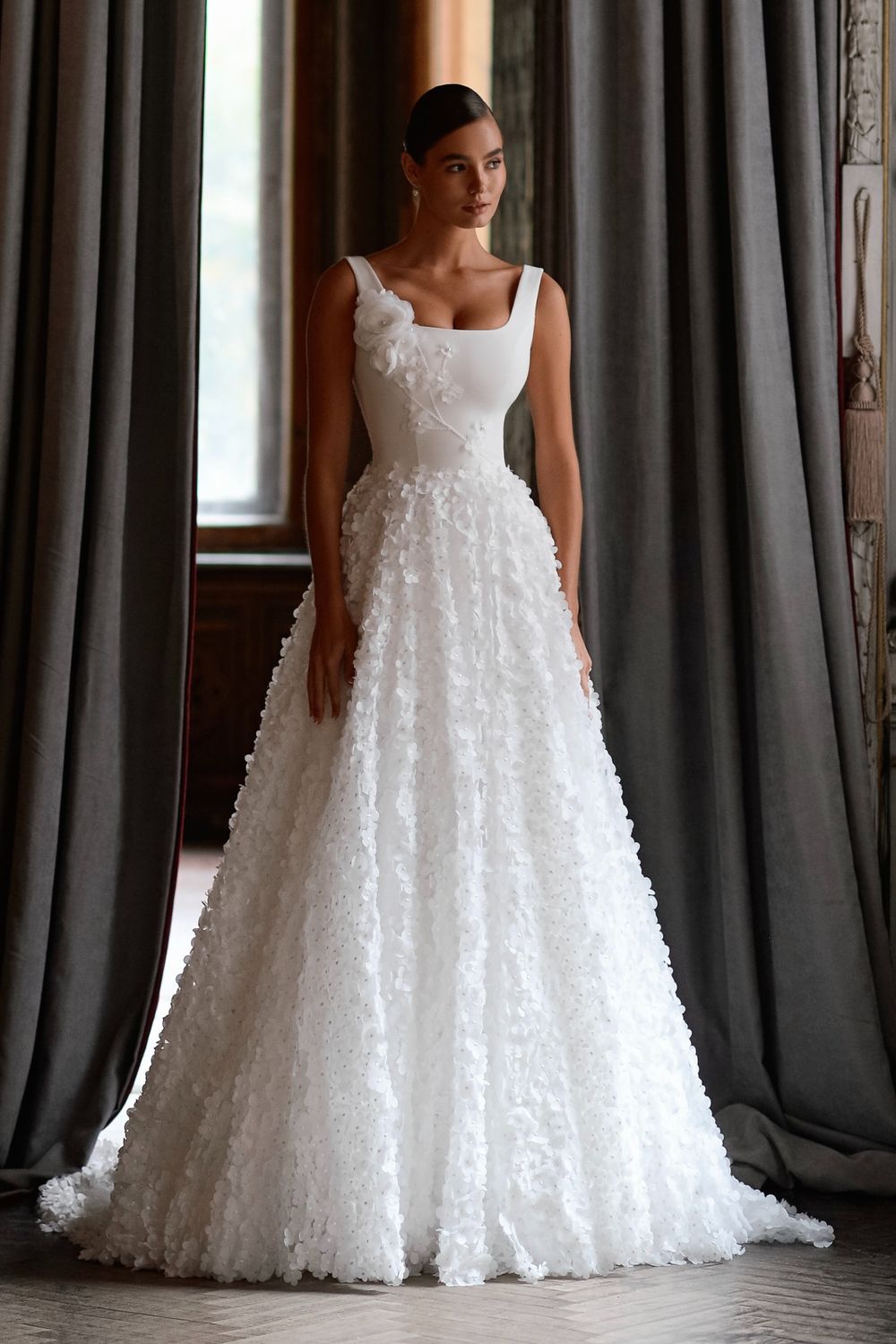 А-силуэт, Пышные, Со шлейфом, Длинные, Лаконичные, Кружевные, С вырезом на спинке, Декольте, На бретельках, Без корсета, Коллекция 2025
