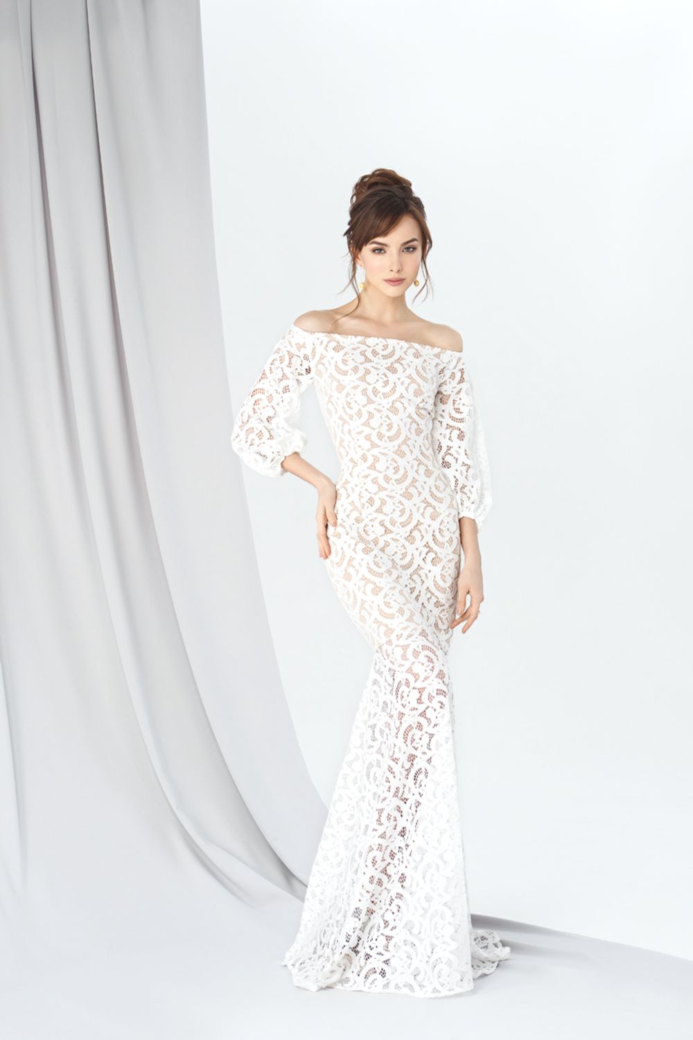 Со шлейфом, Прямые, Рыбка, Длинные, Кружевные, Кружевной верх, С рукавами, С открытыми плечами, Без корсета