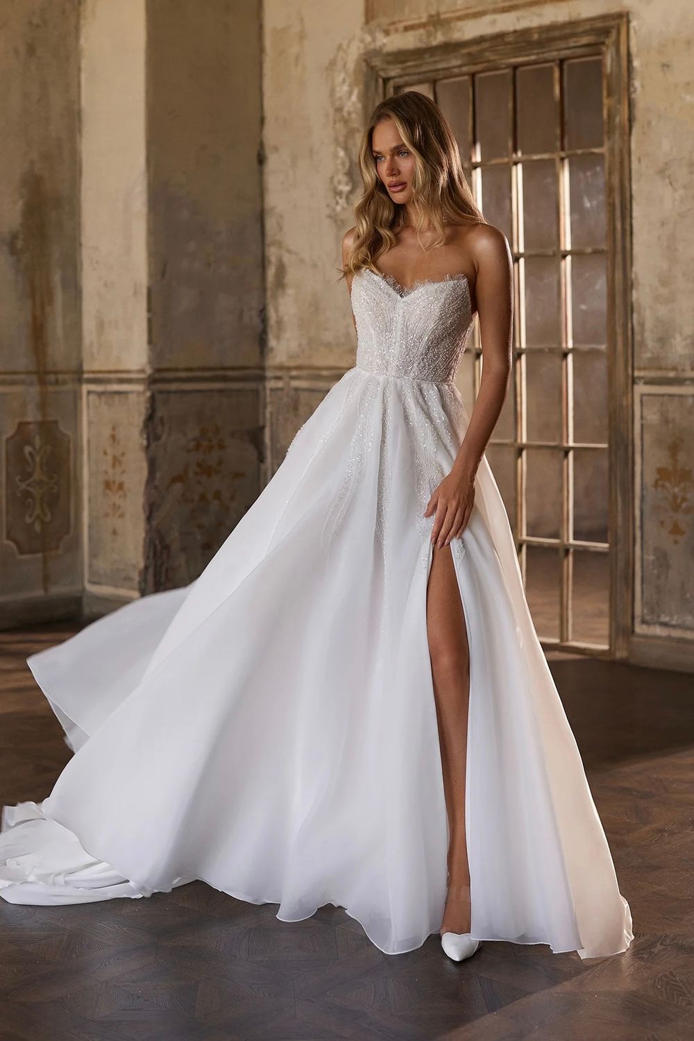 А-силуэт, Со шлейфом, Длинные, С открытой спинкой, Декольте, С открытыми плечами, С корсетом, С разрезом на ноге, Органза, Коллекция 2026