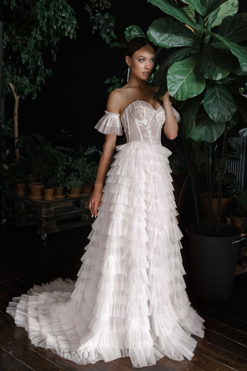 Длинное фатиновое платье Бруна с корсетом и открытой спинкой создаст нежный и воздушный образ. А-силуэт, а также пышная юбка с оборками и шлейфом визуально стройнят фигуру. Прекрасно дополняет образ декорированный бусами верх с открытыми плечами и короткими рукавами вместе с декольте в форме полусердца.