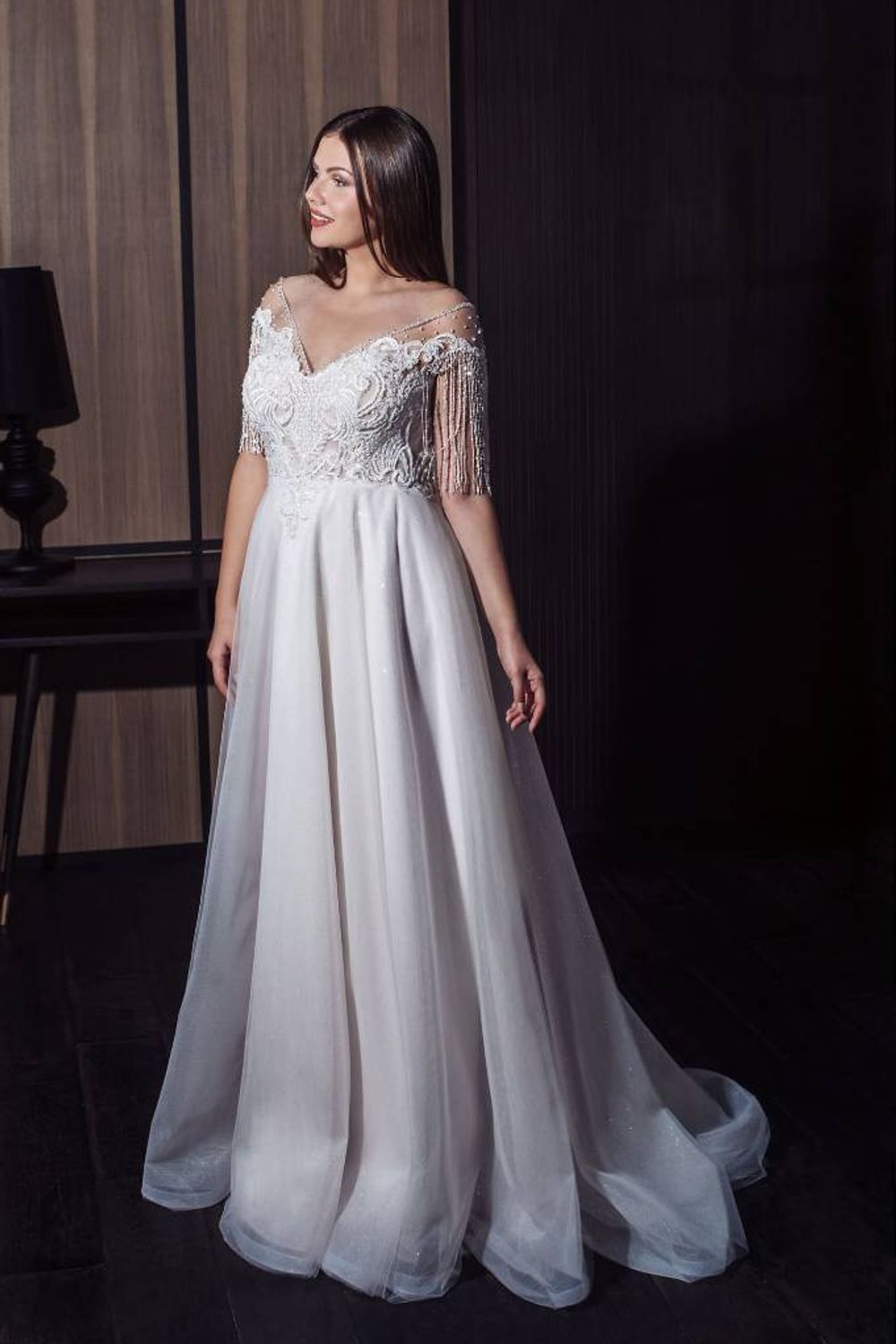 Длинное платье большого размера со шлейфом Занетта это смешение двух модных ныне стилей – рустик и Бохо. Классический А-силуэт с блестящей фатиновой юбкой прекрасно сочетается с кружевным верхом с корсетом. Слегка спущенное плечо из сетки с ажурными элементами переходит в имитацию рукава, выполненного из бахромы.