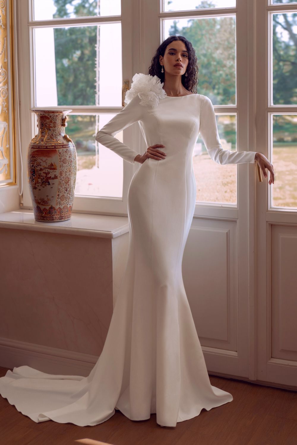 Со шлейфом, Прямые, Рыбка, Длинные, Минимализм, Лаконичные, Закрытый верх, С открытой спинкой, С длинным рукавом, С рукавами, С корсетом, Креп, Коллекция 2026