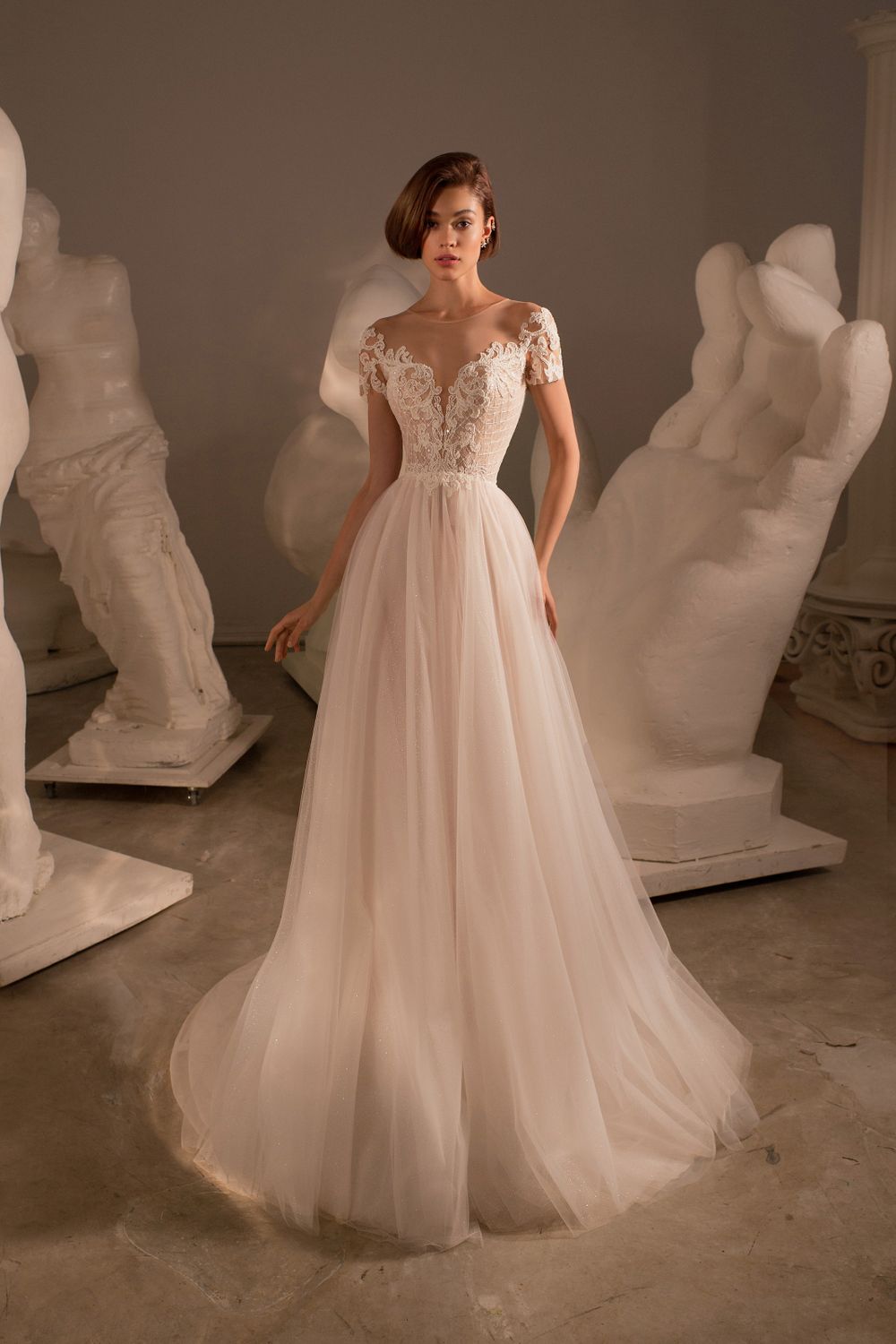 Длинное платье с открытой спинкой и открытыми плечами А-силуэта Асгейра создаст образ настоящей сказочной принцессы. Первое, на что обращаешь внимание – эффектный кружевной верх с корсетом, дополненный глубоким вырезом в форме V. Кружевные элементы также повторяются на коротких рукавах. Не менее стильно смотрится пышная фатиновая юбка со шлейфом с блестящей поверхностью.