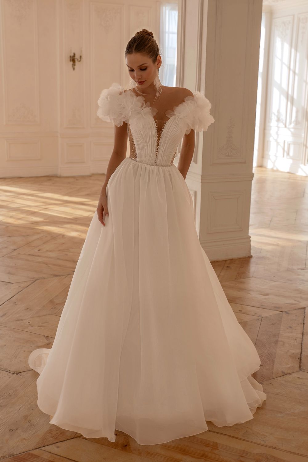 А-силуэт, Со шлейфом, Длинные, С вырезом на спинке, На бретельках, С корсетом, V вырез, Органза, Коллекция 2026