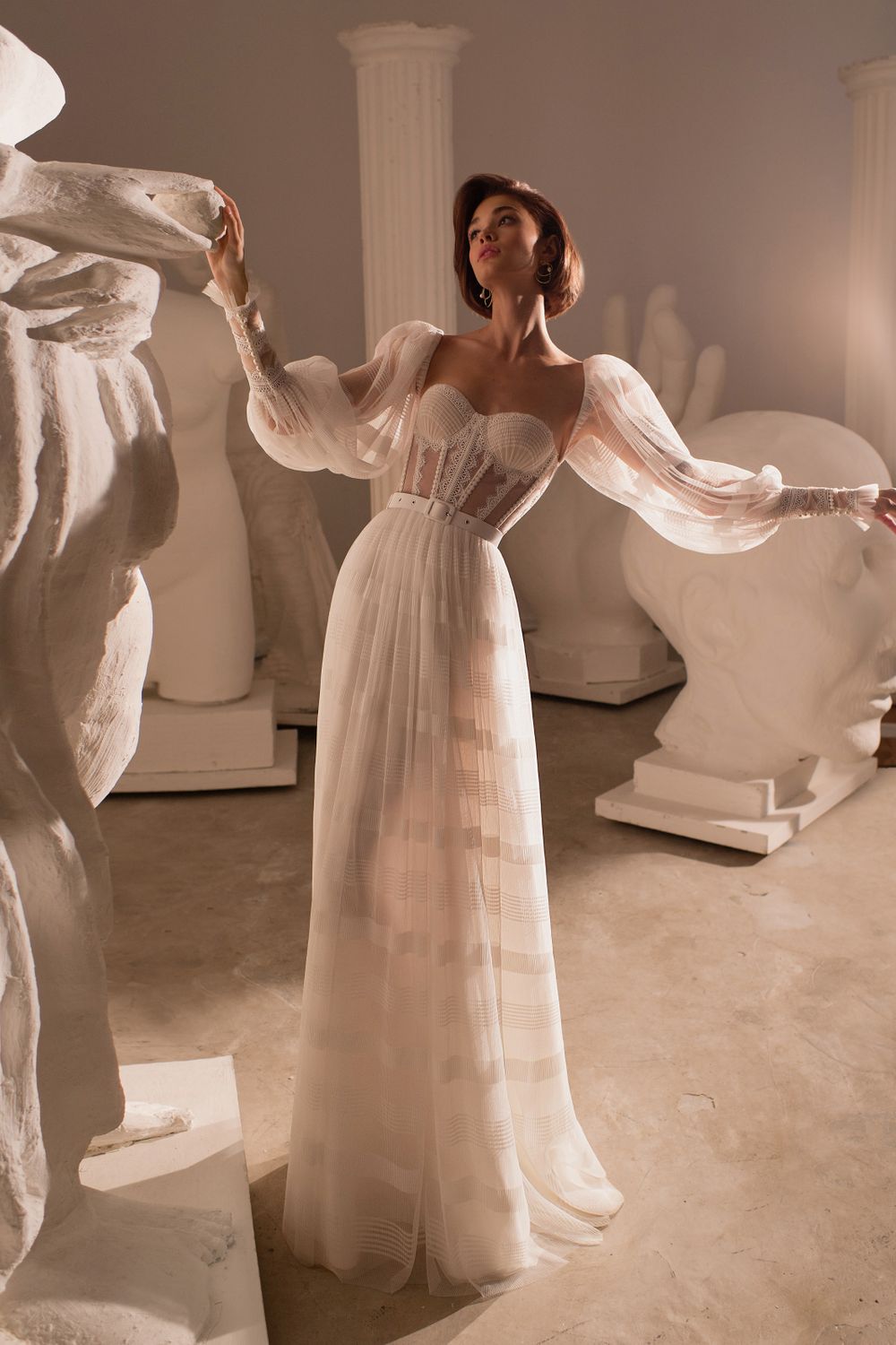 Платье-трансформер с элементами бохо и рустик Каприита стильное и дерзкое одновременно. Модель А-силуэта с длинными съёмными рукавами и открытой спинкой дополнена замысловатым корсетом с прозрачными вставками. Декоративные горизонтальные полосы на длинной юбке перекликаются с такими же полосами на фатиновых рукавах. Кружевной верх с открытыми плечами завершается фигурным вырезом в зоне декольте в форме сердца.