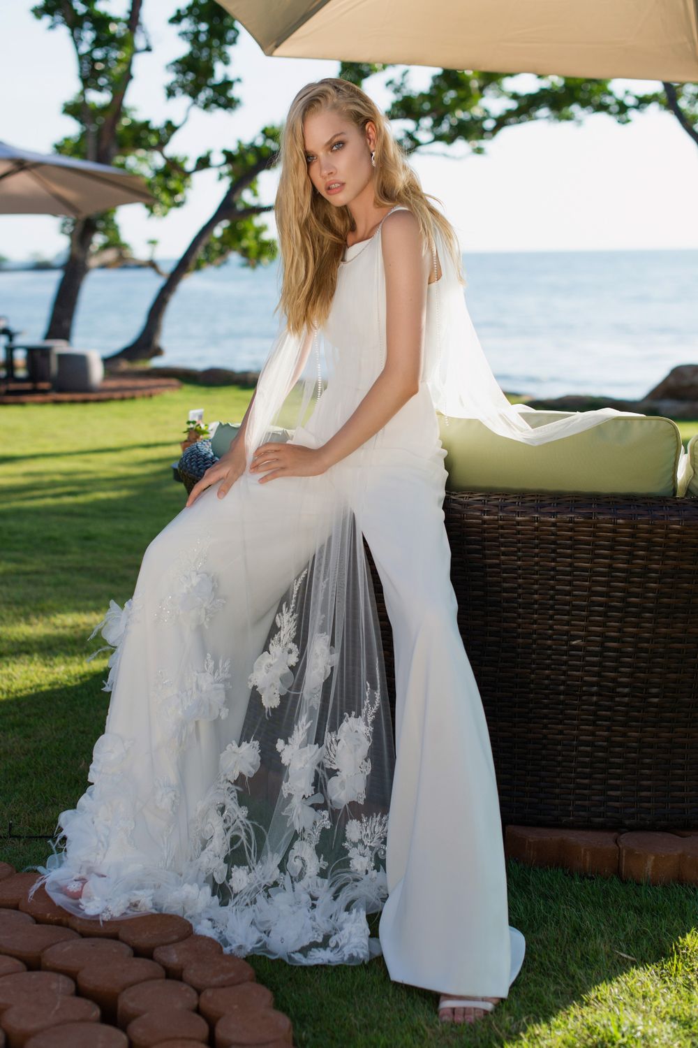Лаконичный брючный костюм-трансформер с вырезом на спинке легко превращается в свадебное платье для ЗАГСа. Достаточно лишь дополнить его длинной фатиновой накидкой с шикарными кружевными узорами, расположенными по низу. Дизайн костюма Карлота выполнен в стиле минимализм. Никаких лишних деталей – только закрытый верх без корсета и атласные прямые брюки.
