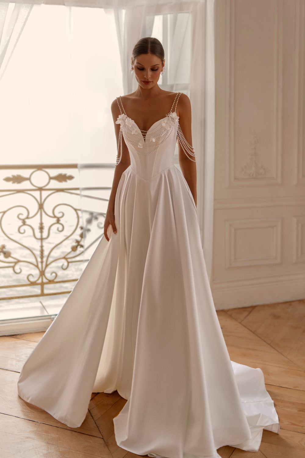 А-силуэт, Со шлейфом, Длинные, Лаконичные, Атласные, С открытой спинкой, На бретельках, С открытыми плечами, С корсетом, V вырез, Коллекция 2026