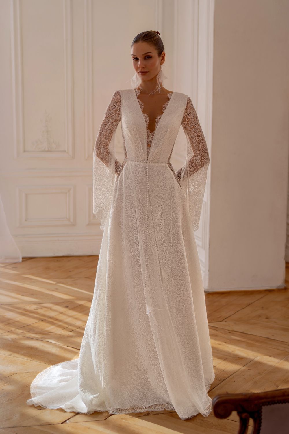 А-силуэт, Со шлейфом, Длинные, Кружевные, С кружевной спинкой, С длинным рукавом, С рукавами, С корсетом, V вырез, Коллекция 2026