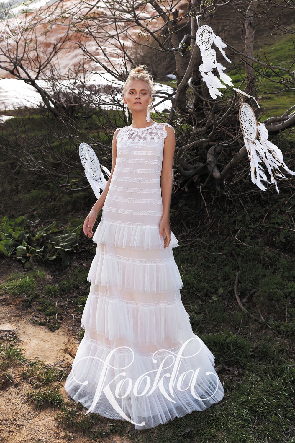 Фатиновое винтажное платье без корсета с закрытым верхом Сунлури станет отличным решением для пляжной церемонии. Модель А-силуэта подходит для беременных, также в наличии есть большие размеры. Длинное прямое платье с кружевным верхом дополнено воздушной многослойной юбкой с такими же кружевными элементами. Горловину украшают воздушные лёгкие пёрышки.