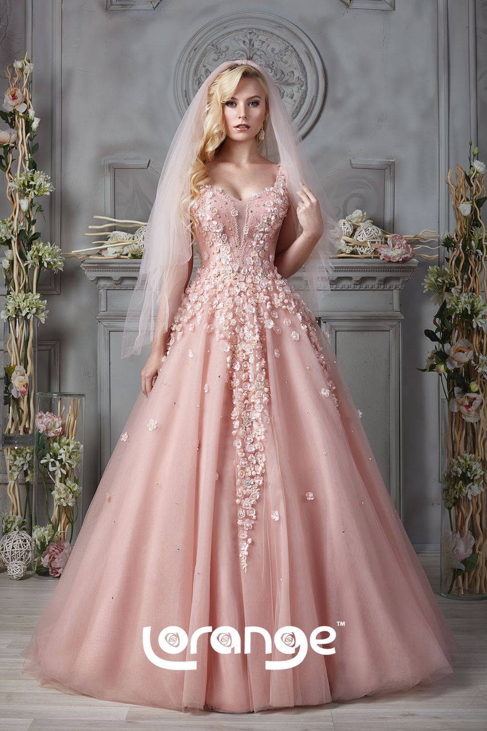 Пышное платье бренда Lorange отлично скроет недостатки фигуры, благодаря женственному А-силуэту. Кружевной верх с корсетом и вырезом на спинке украшен миниатюрной V-образной вставкой из кружева в области декольте. Лиф на широких бретельках покрывает блестящий ажурный узор. Фатиновая юбка с длинным шлейфом декорирована россыпью объемных цветов.