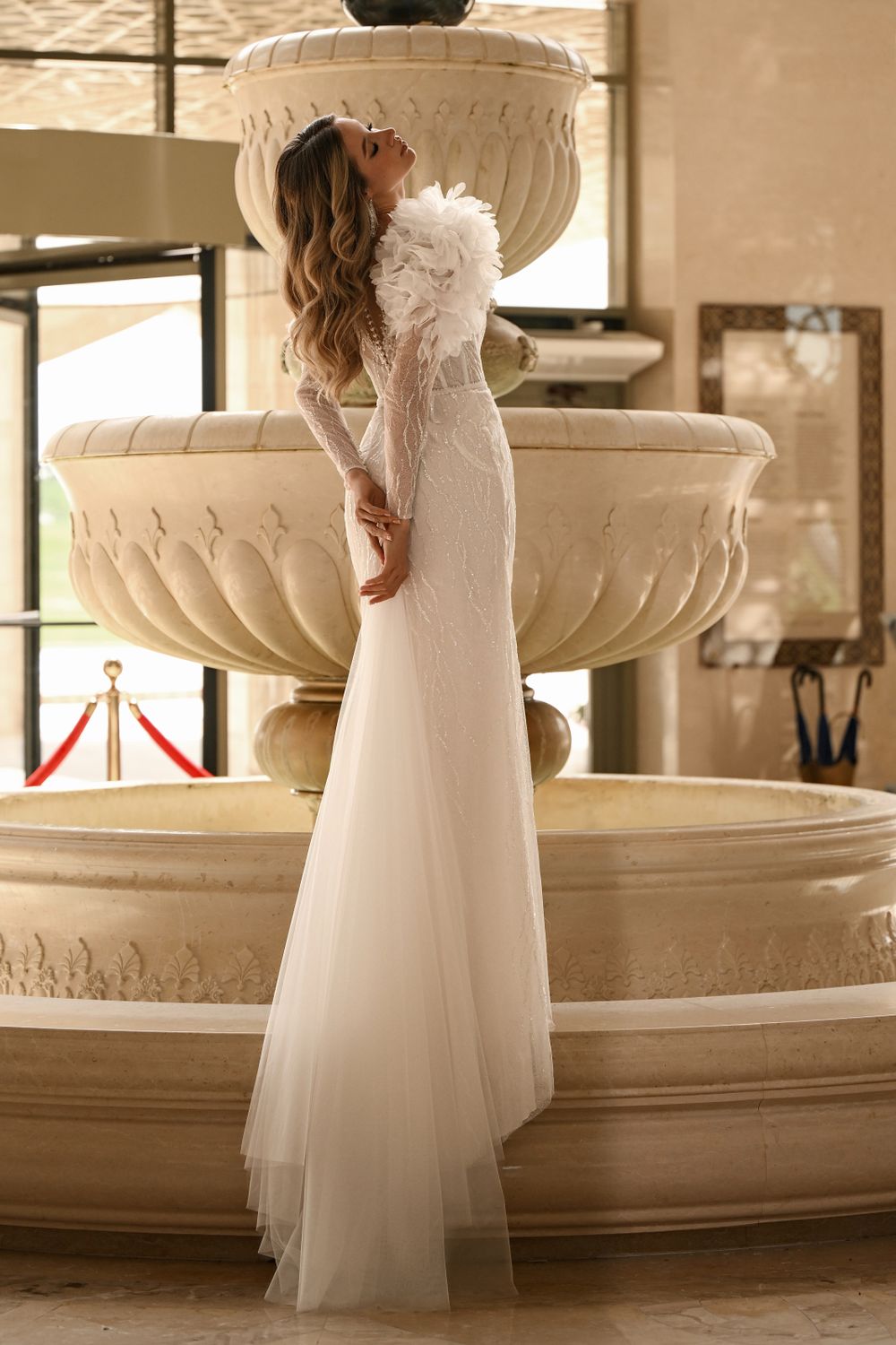 Со шлейфом, Прямые, Рыбка, Длинные, Блестящие, Кружевной верх, С вырезом на спинке, С длинным рукавом, С рукавами, С корсетом, V вырез, Коллекция 2026