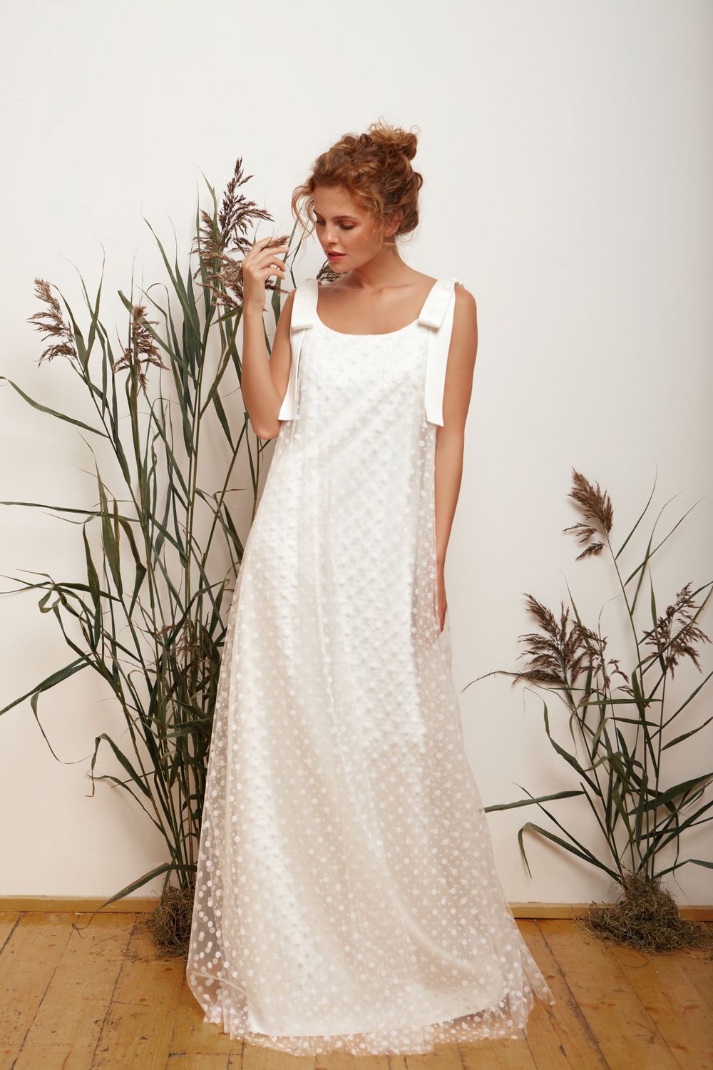 Винтажное платье в стиле рустик Эйлиш без корсета на широких бретельках, декорированных бантами, имеет свободный прямой фасон и прекрасно подойдёт в качестве пляжного варианта или для беременных. Длинная фатиновая юбка со шлейфом украшена лёгким ажурным орнаментом в манере стиля Бохо. Модель доступна в больших размерах.
