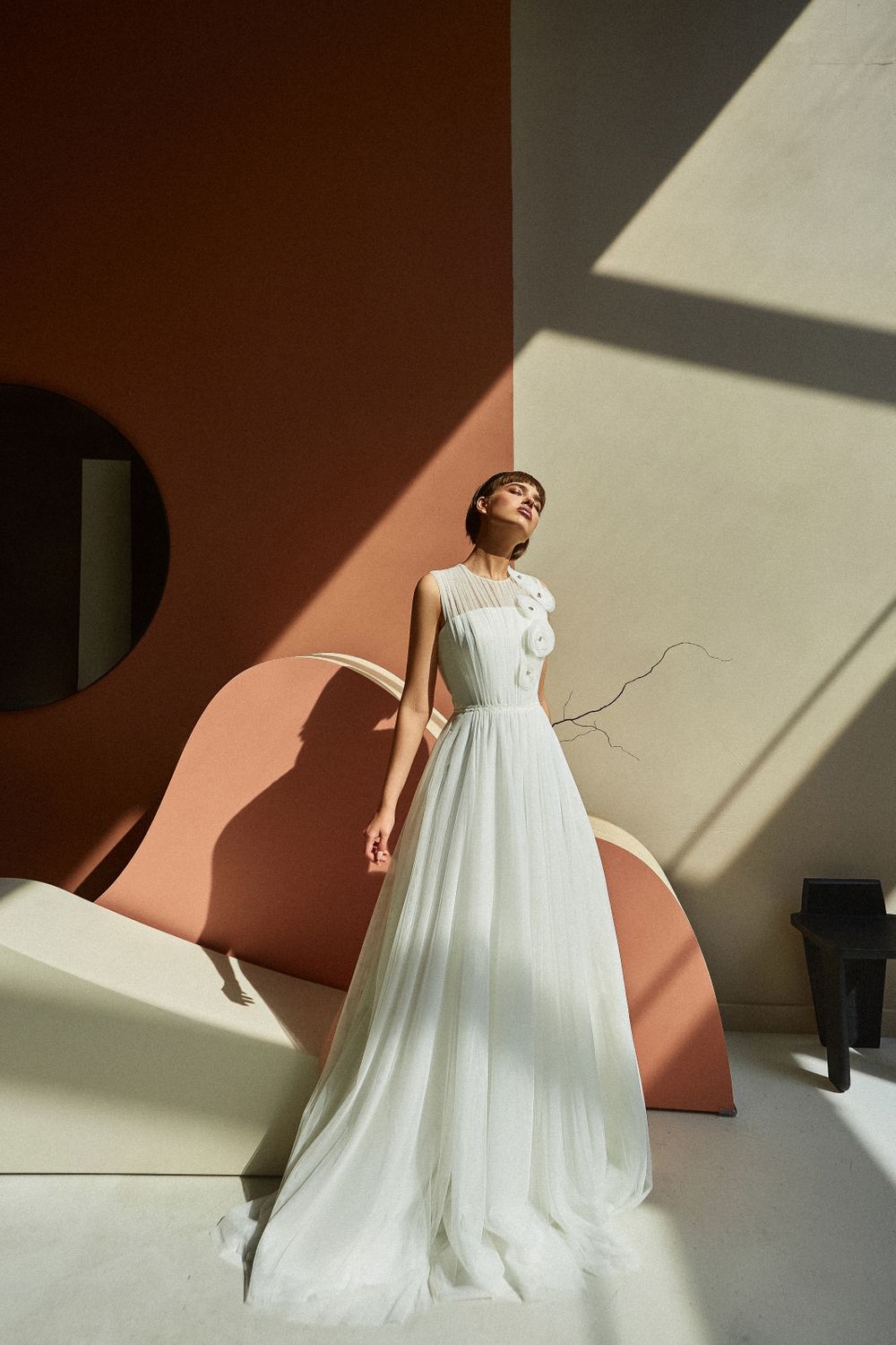 Лаконичное фатиновое платье Элма придётся по вкусу романтичной влюблённой девушке. Закрытый верх без корсета украшен оригинальными цветами из ткани. Пышная юбка с длинным шлейфом придаёт образу особую женственность, грациозность, изящество. А-силуэт делает фигуру ещё более стройной.