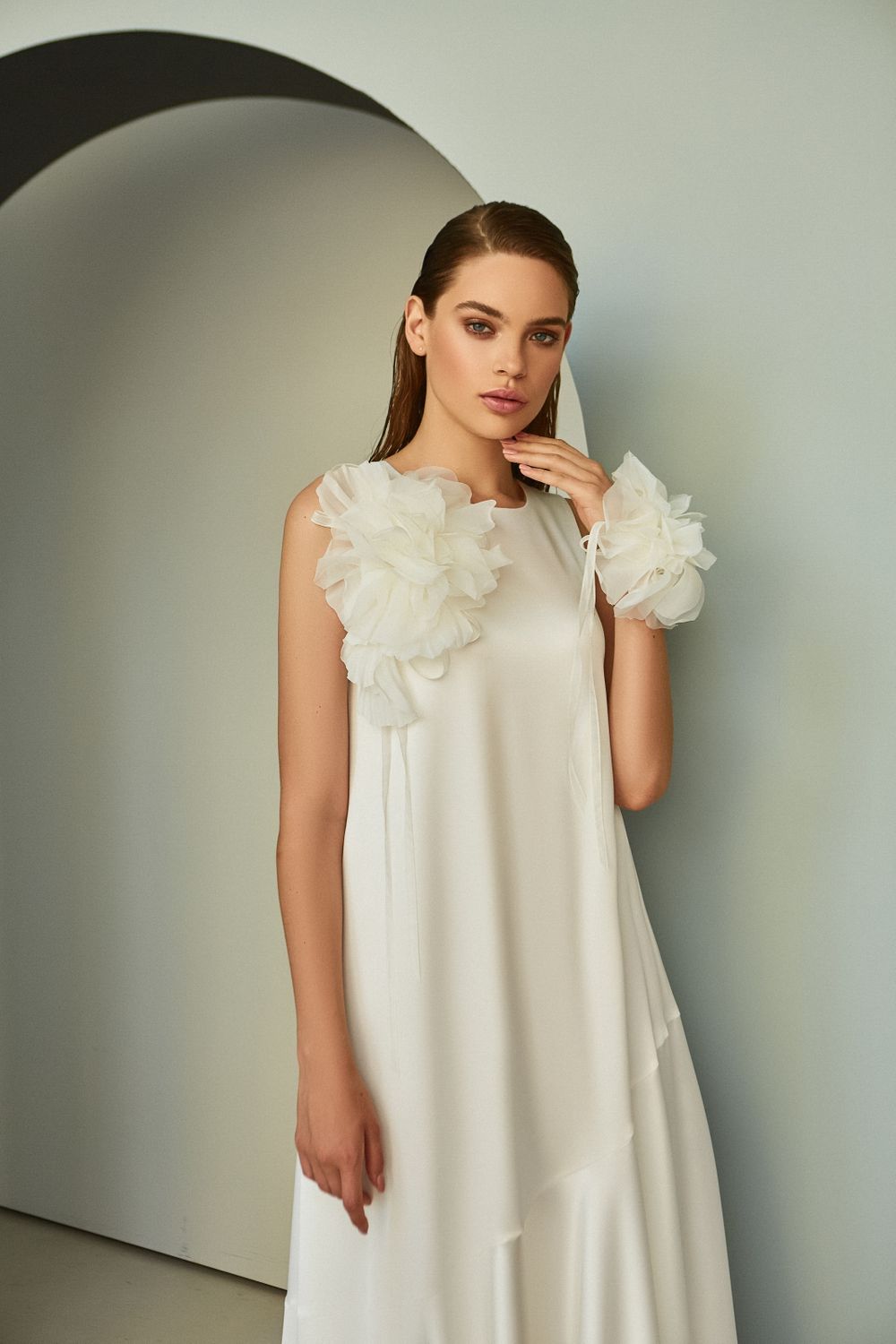 Свадебное платье для ЗАГСа Этолин, благодаря прямому лаконичному крою без корсета, отлично подходит беременным. Длинная модель без рукава, с закрытым верхом и округлой горловиной создана в стиле минимализм. Атласная ткань струится плавными волнами и красиво переливается при естественном или искусственном освещении.