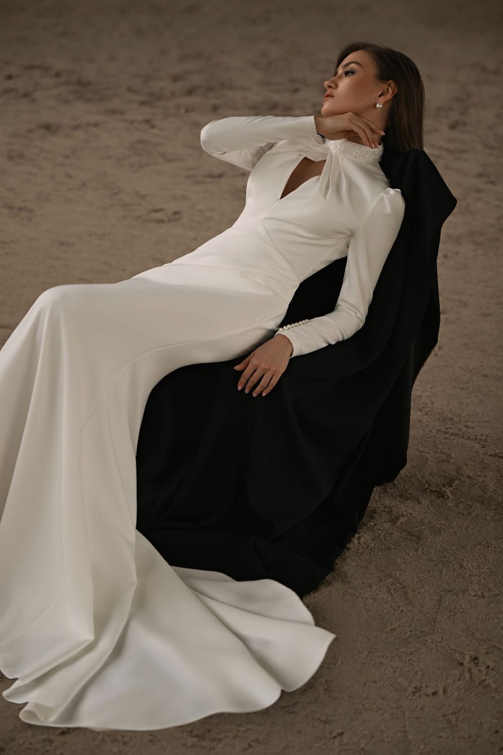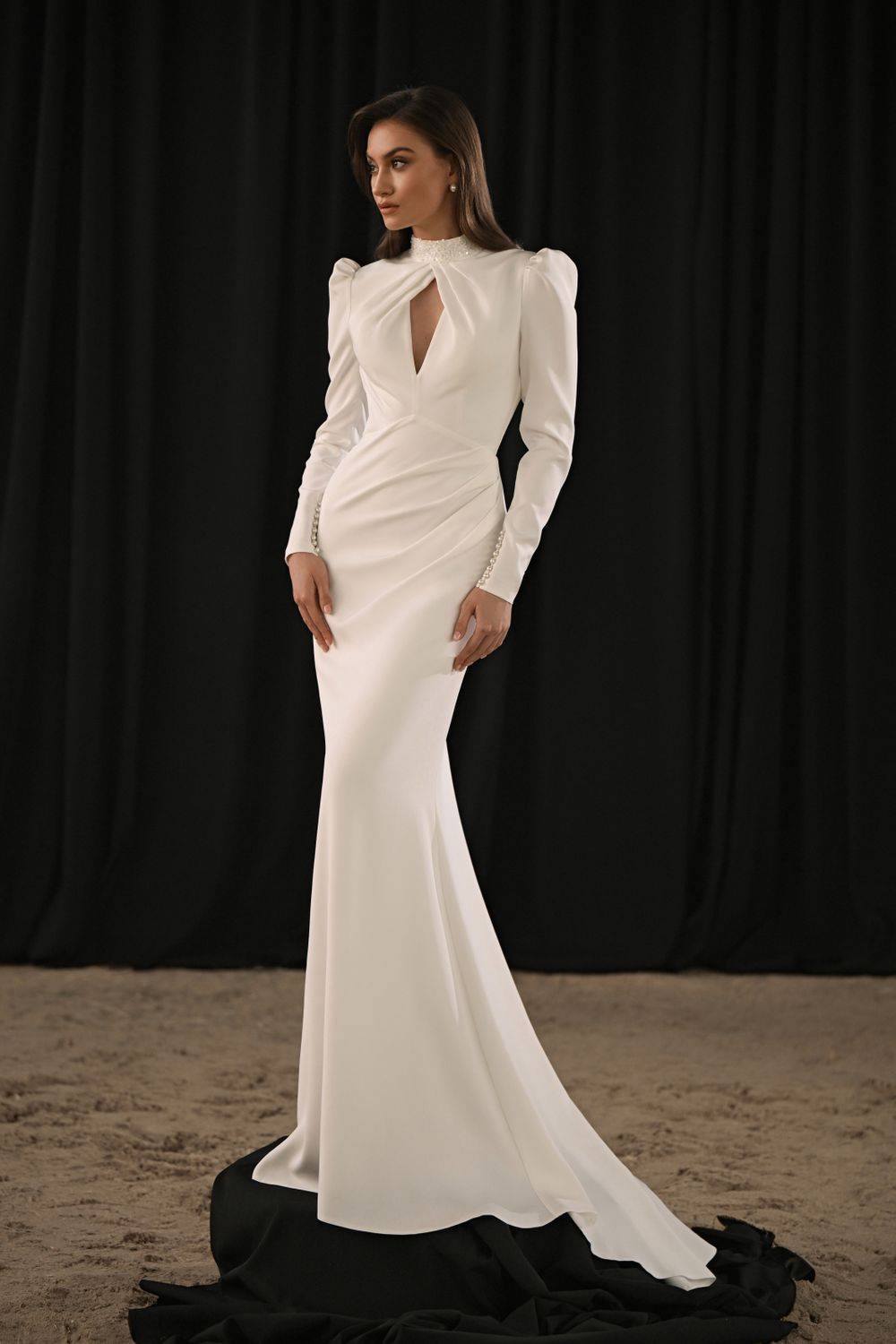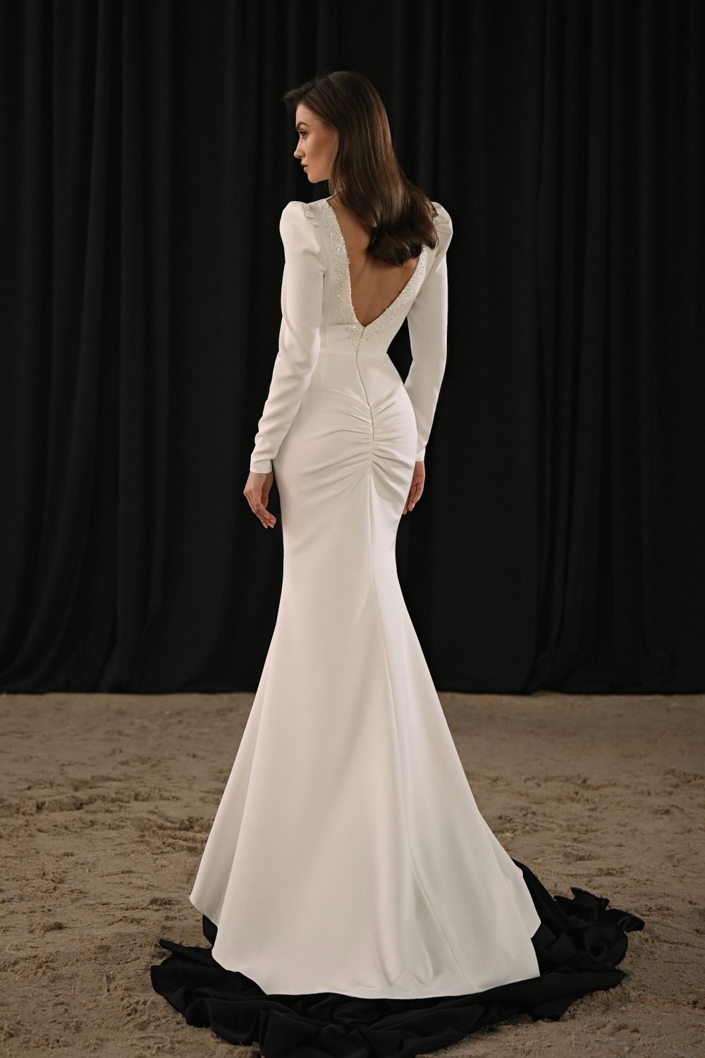 Со шлейфом, Прямые, Рыбка, Длинные, Минимализм, Лаконичные, С вырезом на спинке, С длинным рукавом, С рукавами, Без корсета, V вырез, Креп, Коллекция 2026