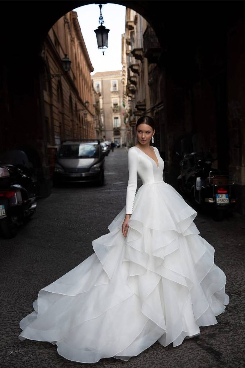 А-силуэт и лаконичный декор платья 19394 делают его подходящим даже для венчания. Верх без корсета с открытой спинкой и длинными рукавами выполнен из шёлка в стиле минимализм. Эффектным контрастом к нему выступает пышная длинная юбка со шлейфом, украшенная воздушными рюшами из органзы. Модель с рукавами, вырезом на спинке и в области декольте неизменно будет приковывать внимание к её обладательнице.