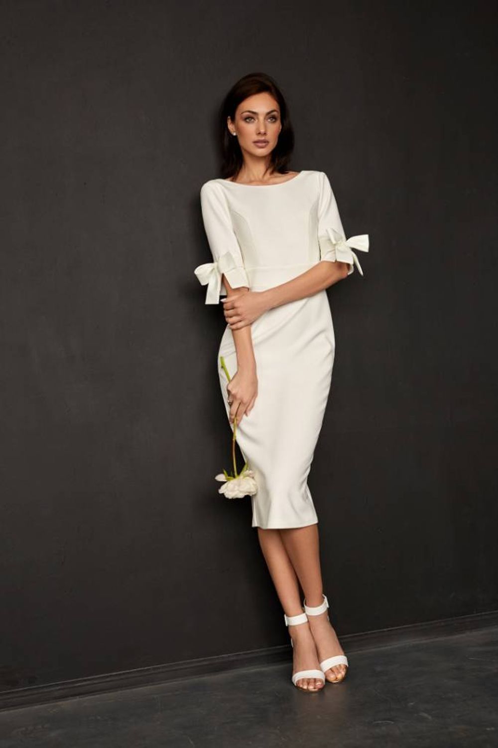 Атласное платье-миди без корсета Пэгги с открытой спинкой и закрытым верхом будет органично смотреться и в качестве коктейльного наряда, и как свадебное платье для ЗАГСа. Прямое короткое платье без корсета выполнено в стиле минимализм, его лаконичный крой не стеснит движений. К тому же, модель с глубоким вырезом на спинке, безусловно, производит впечатление. В качестве декора на рукавах используются милые декоративные банты.